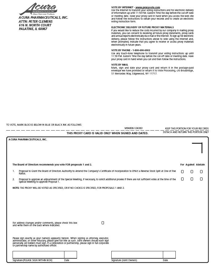 Acura Pharmaceuticals, Inc, (the “Company”) is filing the attached proxy card to amend the proxy card in the Proxy Statement that was originally filed on July 14, 2015 to correct a typographical error in the proxy card. The proxy materials delivered to the Company’s shareholders will include the attached proxy card. Other than this change to the proxy card, the Proxy Statement remains unchanged.